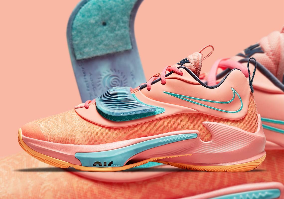 Как и у предыдущих моделей Zoom Freak у новых «фриков» необычный дизайн. Верх кроссовка выполнен из комбинации текстиля, многослойной сетки и кожзаменителя. Абсолютно новая деталь — фиксирующий ремешок на липучке, закрывающий шнуровку и отвечающий за стабилизацию стопы. На внутренней стороне левой липучки надпись «I Am My Father’s Legacy». На внутренней стороне правой липучки — имена родителей, братьев и сына игрока.